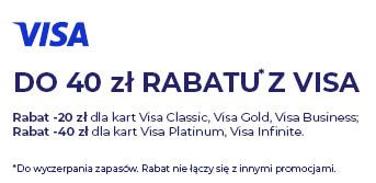 Rabat -20 zł dla kart Visa Classic, Visa Gold, Visa Business; -40 zł dla kart Visa Platinum, Visa Infinite.Do wyczerpania zapasów. Rabat nie łączy się z innymi promocjami.